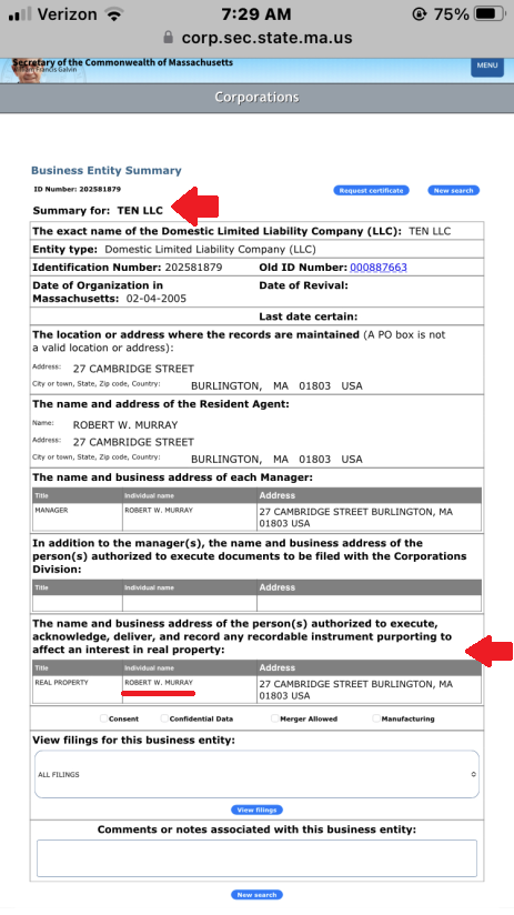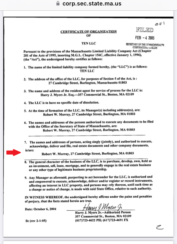 Murray is described in some documents as the "manager" of Ten LLC. He is also the manager, but not only the manager. He is the resident agent (person who receives all corporate communications), and "the person authorized to execute … any recordable instrument". He also signed Ten LLC's annual report. The original can be found via a search of the State Secretary's Corporation page.