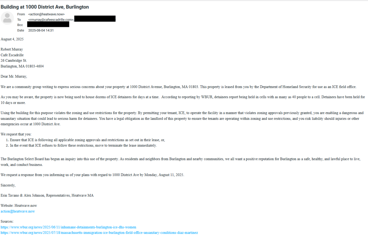 Before taking further action, we sent an email to Murray asking for a comment on his plans for the ICE facility, with a deadline of August 11th, 2025. We did not receive a response. We know that the email was received, because we were added to Cafe Escadrille's mailing list.